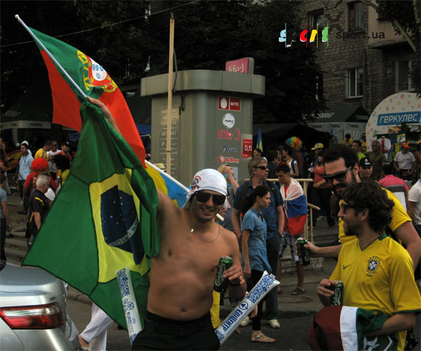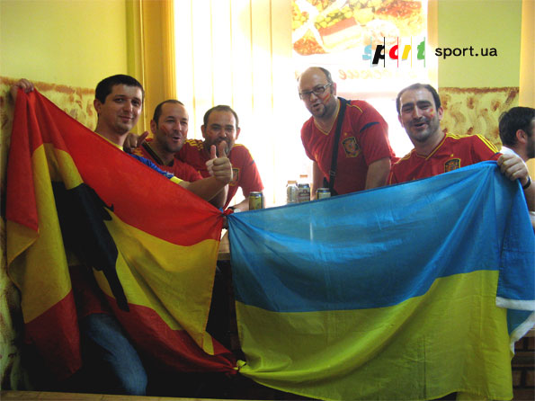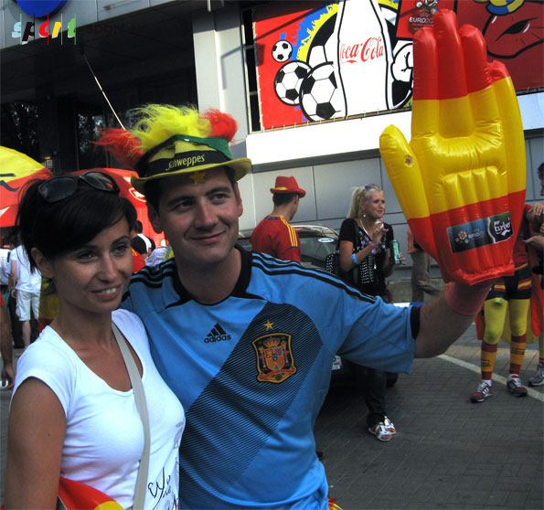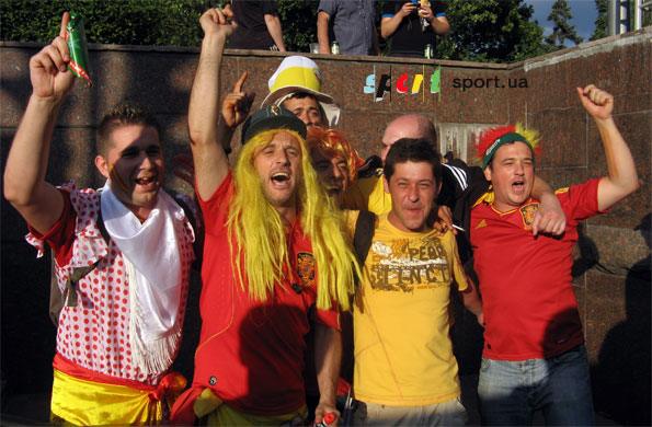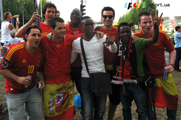 Пока писАлись несколько предыдущих строк, Михаил Шаповалов сообщил, что территория под стадионом уже просто кишит испанскими болельщиками, которые распевают песни, танцуют и фотографируются с «неиспанцами». В общем, атмосфера вокруг матча принимает состояние праздничной. Португальцев, правда, пока немного.