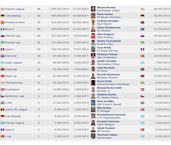 На Евро-2012 больше всего игроков представили английскую Премьер-лигу - 69, среди которых самым дорогим стал Уэйн Руни (65 миллионов евро). 43 игрока представляли немецкую Бундеслигу, 33 - испанскую Примеру и 30 - итальянскую Серию А. Украинскую Премьер-лигу представили 30 футболистов, а самое малое представительство на Евро было от турецкой Лиги, швейцарской Суперлиги и израильского чемпионата - по одному представителю.