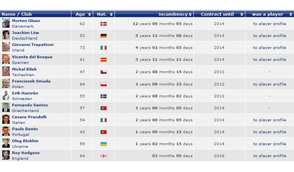 Наставник сборной Дании Мортен Ольсен - старейшина Евро-2012. Этот специалист управляет командой вот уже на протяжении 12 лет. Йоахиму Леву (сборная Германии) с его пятью годами и Джованни Трапаттони (сборная Ирландии) с 4 годами - до датчанина еще очень далеко. Самый «не опытный» тренер - Рой Ходжсон, который проработал с командой до старта чемпионата всего 1.5 месяца. У Олега Блохина на счету 1 год и 2 месяца.