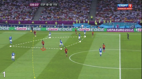 Матч начался с ожидаемого, судя по словам самого Пранделли, который заявлял о желании сохранить курс на целостную атакующую игру команды, в первую очередь на основе противопоставления своих козырей в центре поля. Команда Италии играла высокий прессинг при потере мяча, заставляя, например Хави, отходить глубже на свою половину поля для развития позиционной атаки. Вкупе с традиционной манерой игры испанской команды это обусловило примерное равенство, если не в остроте моментов, то в количестве атак и владению мячом, что в дальнейшем, несмотря на разгромный счёт, составило общий тренд матча, по крайней мере, в течение полутора таймов..jpg) 1. Начало матча, пока ещё итальянцы высоко и мощно прессингуют. Это вынуждает Серхио Рамоса перевести мяч в направлении Арбелоа на другой фланг.