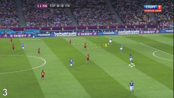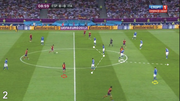 1. Начало матча, пока ещё итальянцы высоко и мощно прессингуют. Это вынуждает Серхио Рамоса перевести мяч в направлении Арбелоа на другой фланг..jpg) 2. Вторая стадия позиционной борьбы в центре. Разыграв ширину, Испания избавилась от прессинга, и развивает атаку, для чего несколько вглубь выдвинулся Хави (красный). Италия в это же время отходит на свою половину поля, где восстанавливает первую линию защиты и демонстрирует в обороне высокую дисциплину: Кьеллини (белый), который только что прикрывал персонально Силву, отходит назад. Его фланг в это время страховал Де Росси (желтый).