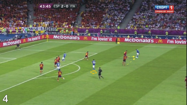 5. Частая для начала второго тайма картина: с мячом Андреа Пирло, Испания в оборонном построении, напоминающем 4–4–2. К атаке Италии теперь уже присоединяется левофланговый Бальцаретти (красный). Иньеста и Силва (желтые) отошли для поддержки обороны.