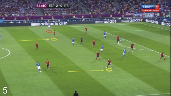 Очевидно, что выход Ди Натале оживил ситуацию Италии в атаке, где, впрочем, столь же мало результативно продолжал действовать Балотелли. Однако и некоторый подъём в начале второго тайма, характерный для уступающей в счёте команды, производил впечатление, что ещё не всё потеряно для Италии. К тому же сами испанцы также несколько уступили инициативу, заиграли на атаку длиннее и проще. Также Иньеста и Сильва, игравшие в первом тайме как обычно фланговых нападающих, отходили назад и регулярно поддерживали команду в обороне..jpg) 5. Частая для начала второго тайма картина: с мячом Андреа Пирло, Испания в оборонном построении, напоминающем 4–4–2. К атаке Италии теперь уже присоединяется левофланговый Бальцаретти (красный). Иньеста и Силва (желтые) отошли для поддержки обороны.