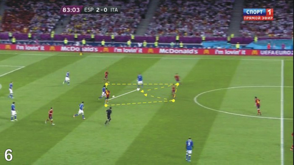 Дальнейшие события на поле были обусловлены счётом и соотношением сил – Италия лишилась не только возможности сократить счёт, но и приобрела угрозы пропустить вновь, т.к. атаки вновь пошли в их сторону. С момента ухода Мотта, Ди Натале едва ли коснулся мяча более трёх раз, хотя Балотелли отошел ниже и стал участвовать в отборах, часто зарабатывая фолы. Вообще лучший бомбардир Италии в этом турнире стал лидером матча по заработанным фолам, которых на его счету 5. Тем не менее, пользы из нескольких полученных стандартов эти моменты не принесли, а продолжали срывать атаки и сбивать атакующий темп..jpg) 6. Момент, предшествующий третьему голу. Уже потеря концентрации итальянцев на последних минутах: казалось бы, мяч отобран Италией, а Де Росси получает его от Пирло. Но в клещах традиционного быстрого ответного прессинга Испания вновь организует быструю результативную контратаку.