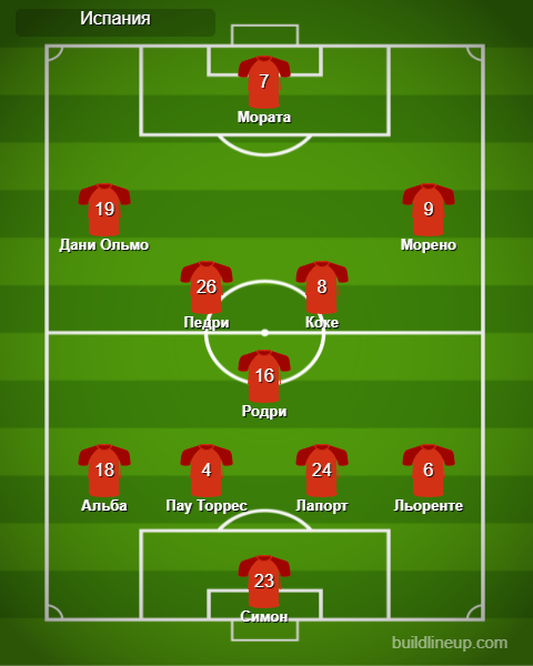 Испания: Симон, Лапорт, Пау Торрес, Льоренте, Альба, Коке (Руис, 68), Родри, Ольмо (Ферран Торрес, 61), Педри, Морено (Сарабия, 68), Мората (Ойарсабаль, 87).Запасные: де Хеа, Санчес, Аспиликуэта, Льоренте, Алькантара, Ферран Торрес, Гарсия, Гайя, Руис, Траоре, Ойарсабаль, Сарабия.