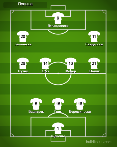 Польша: Щенсны, Беднарек (85), Глик, Берешиньски, Свидерски (Франковски, 67), Клих (Козловски, 55), Модер (Линетты, 85), Зелиньски, Южвяк, Пухач, Левандовски.Запасные: Скорупски, Фабяньски, Давидович, Кендзера, Козловски, Линетты, Рыбусь, Плахета, Франковски, Ковнацки, Шверчок, Хелик.