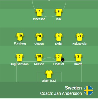 Швеция:Ульсен - Крафт (М. Ульссон, 85), Линделеф, Нильссон, Аугустинссон - Кулусевски (Квайсон, 63), Экдаль, К. Ульссон, Форсберг (Сванберг, 63) - Исак (Ибрагимович, 73), Классон.