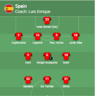 Испания:Симон - Аспиликуэта, Ляпорт, П. Торрес, Альба - Гави (Мендес, 89), Бускетс, Солер (Мерино, 73) - Сарабия (Мората, 59), де Томас (Родриго, 60), Ольмо (Родри, 89).