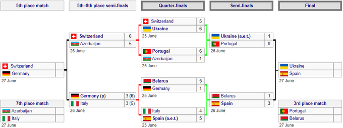 17:30. Беларусь – Германия – 5:118:45. Швейцария – Украина – 5:620:15. Италия – Испания – 4:521:30. Португалия – Азербайджан – 6:1За 5–8 места, 26 июня