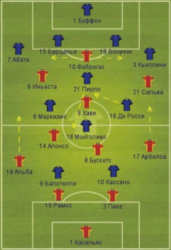 В этом примечательном со всех сторон финале Евро встретились две выдающиеся в тактическом отношении команды. Подопечные Чезаре Пранделли стали главной неожиданностью турнира, вопреки всем обрушившимся на них в преддверии чемпионата бедам, достигнув самого финала. Вспоминая аналогичные обстоятельства («Кальчополли»), предварявшие чемпионат мира 2006 г., где итальянцы достигли абсолютной вершины, начали даже говорить о том, что «Скуадре адзурре» даже лучше входить в крупный турнир прямиком из очередного скандала в Серии А.
